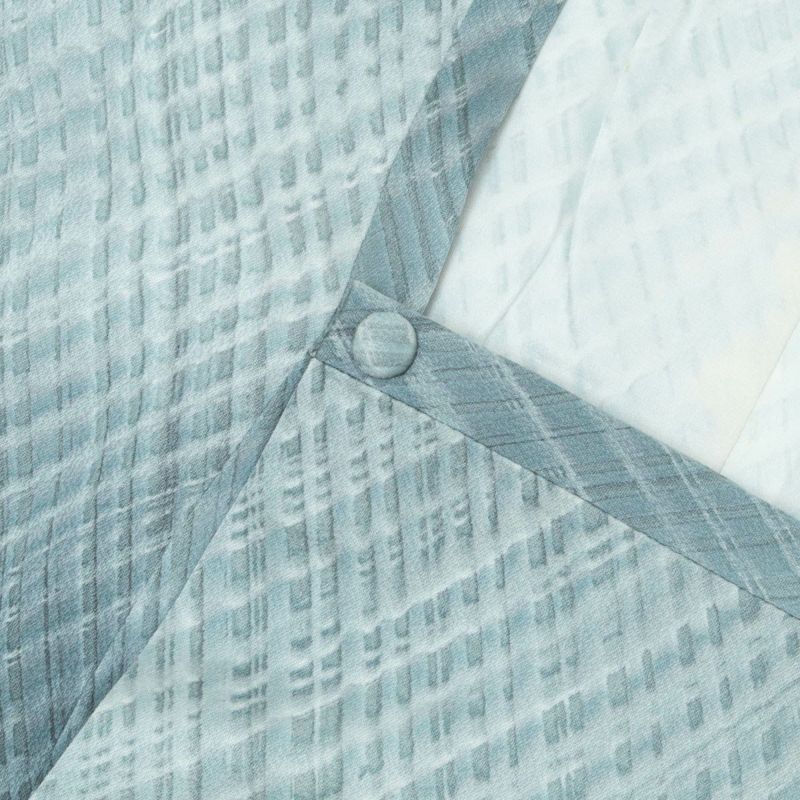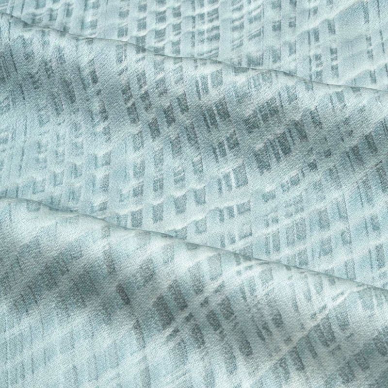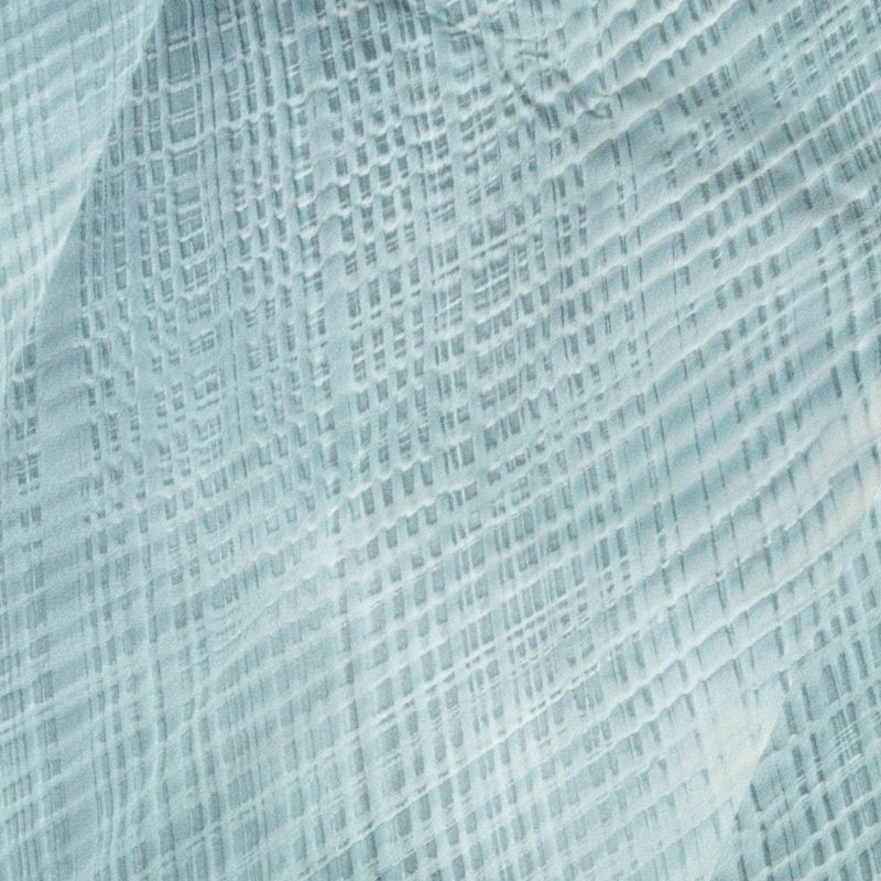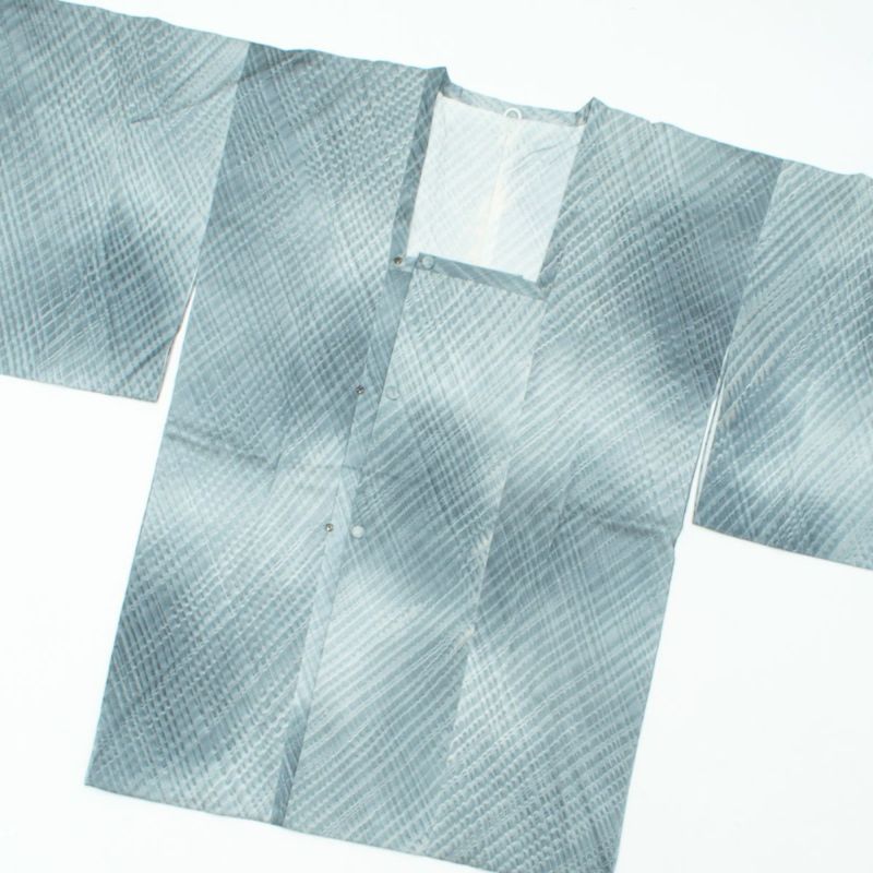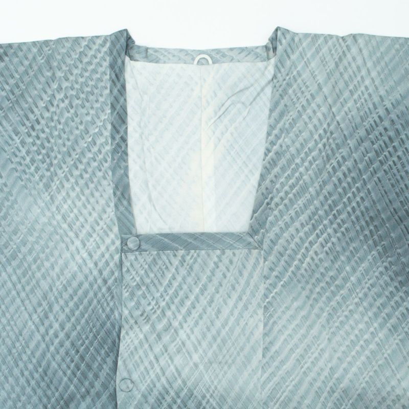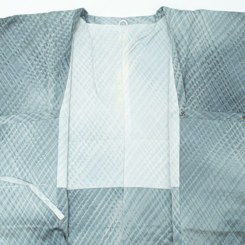 淡い湊鼠色を基調とし、濃淡のグラデーションで奥行きを持たせた格子文様が描かれています。まるで水面に映る光と影を思わせるような柔らかな表情が魅力です。