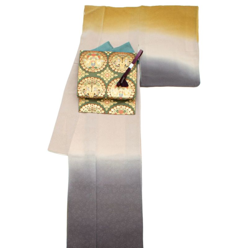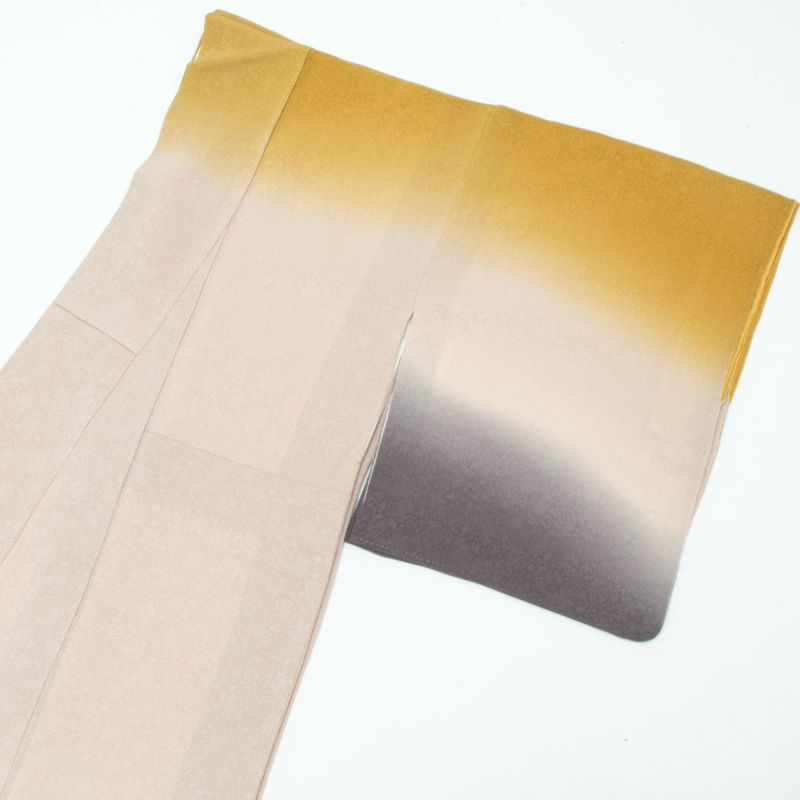 付下げ訪問着 暈し染め 横段染め分け 辛子 灰桜 紅消鼠 正絹 袷です。
