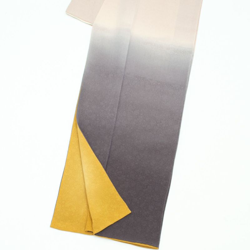 辛子色から灰桜、紅消鼠へと流れるようにつながる横段の暈し染めが印象的な付下げ訪問着です。