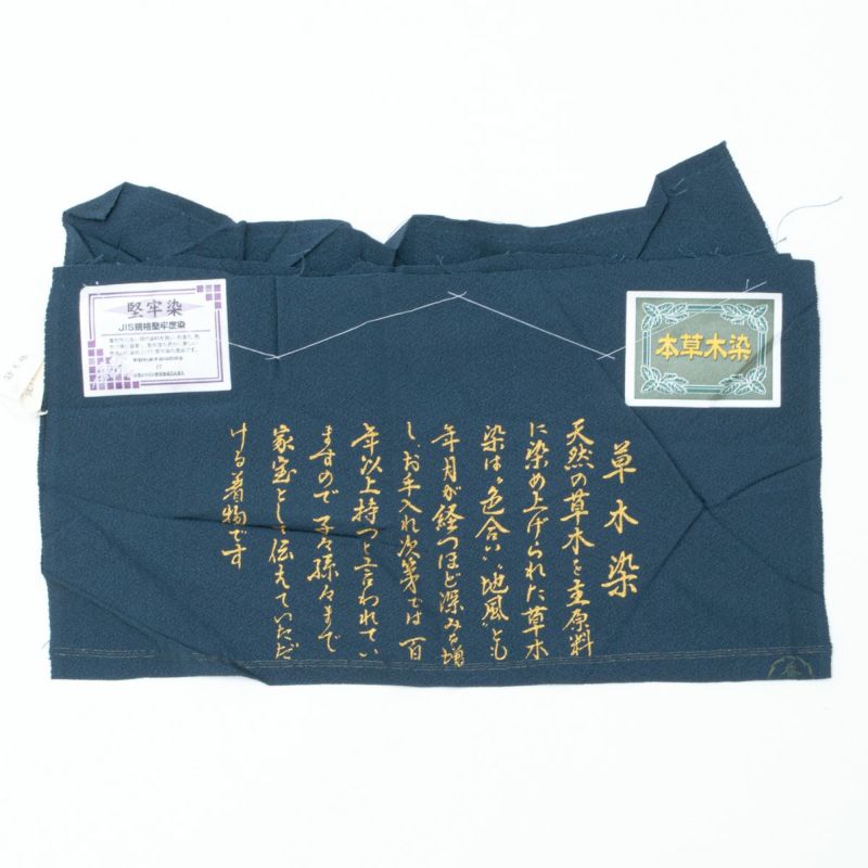 しっとりと深みある高麗納戸(こうらいなんど)の色合いが美しい、草木染による堅牢な色無地です。