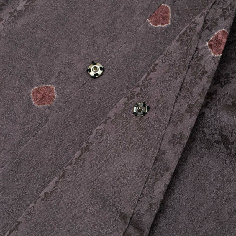 落ち着いた葡萄鼠(ぶどうねず)の深みある色合いに、柔らかな絞り染めの紫鳶(むらさきとび)の丸文が散りばめられた上品な道中着です。