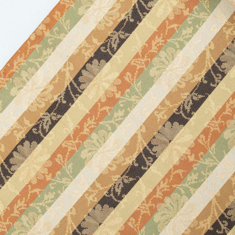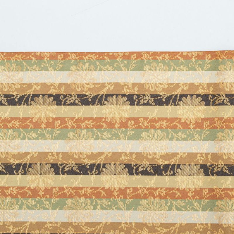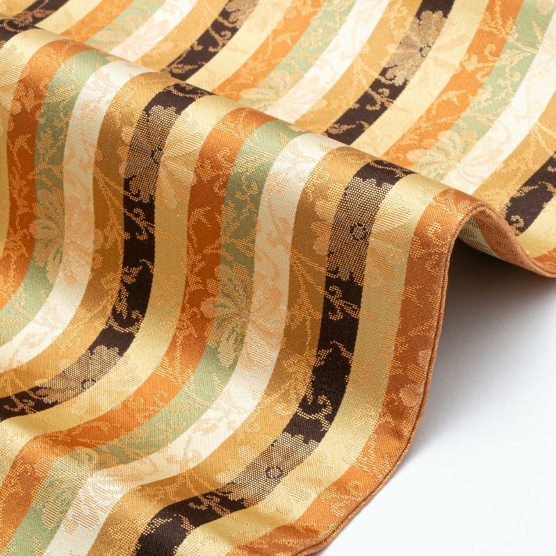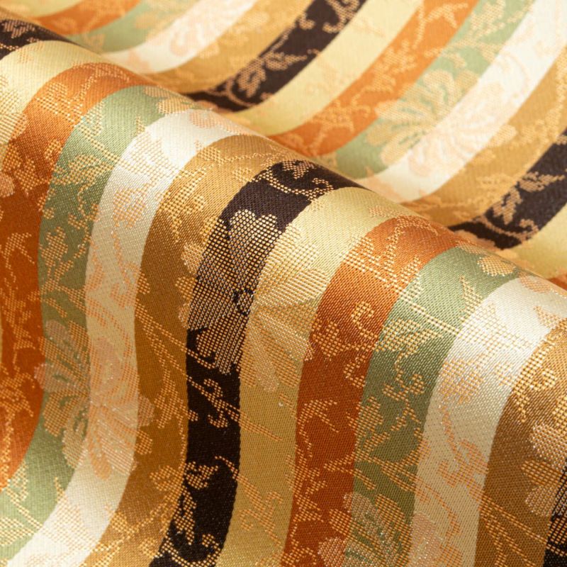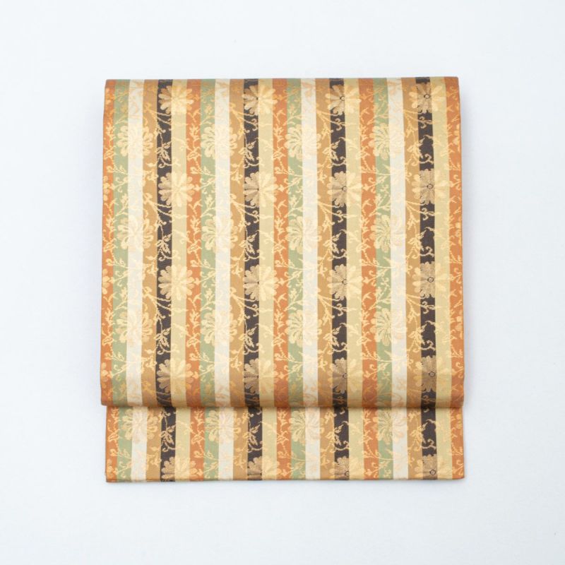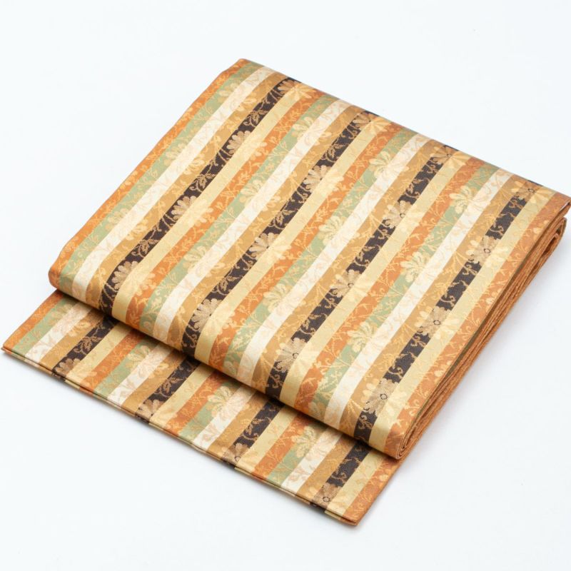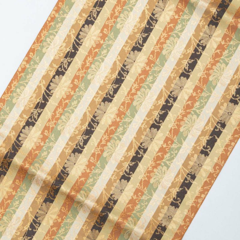 名物裂の趣を感じさせる、格調ある菊唐草を縞文様に織り上げた開き名古屋帯です。