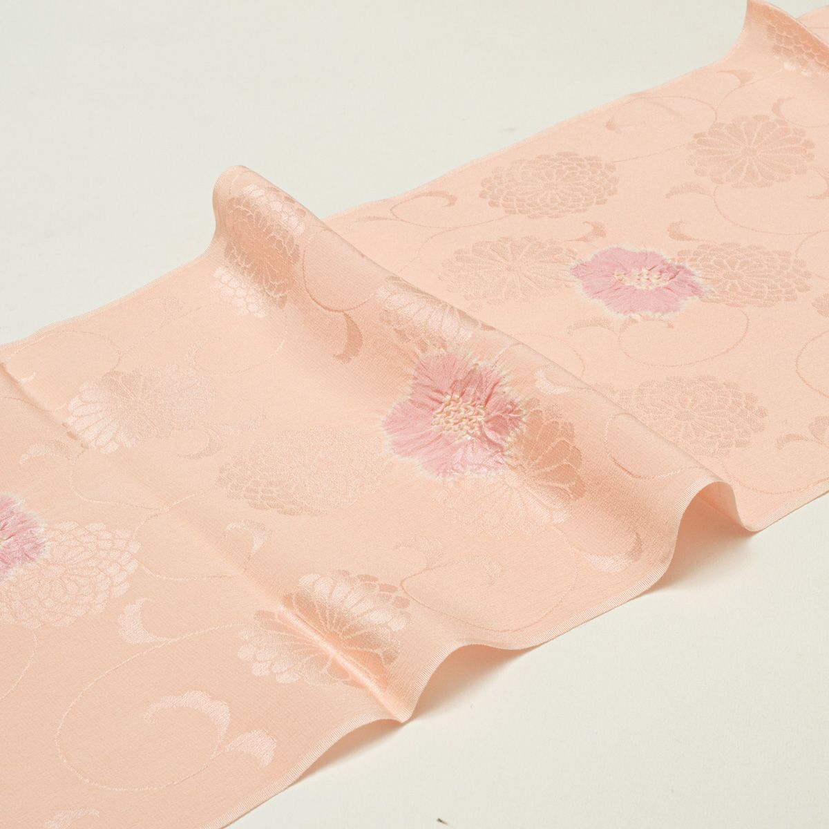帯揚げ 紋綸子 絞り 輪出し 花文 水柿 紅梅色 正絹