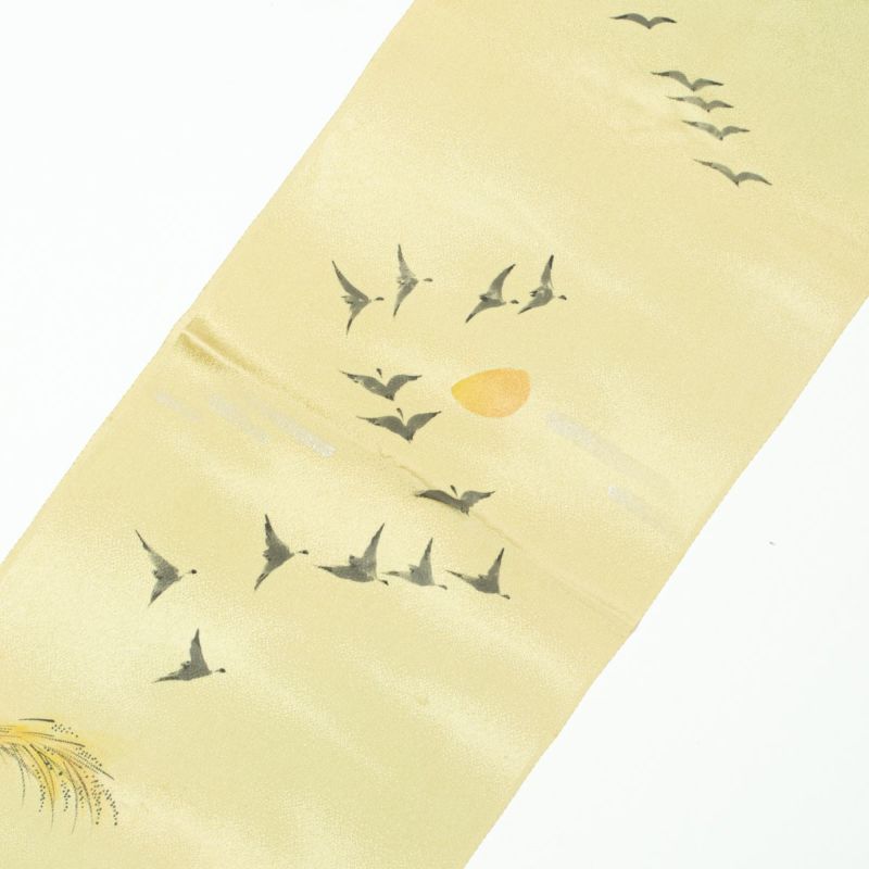 「帯揚げ 粗密 梨地 紋意匠 柳鼠 手描き 雁の群れ 正絹 」です。