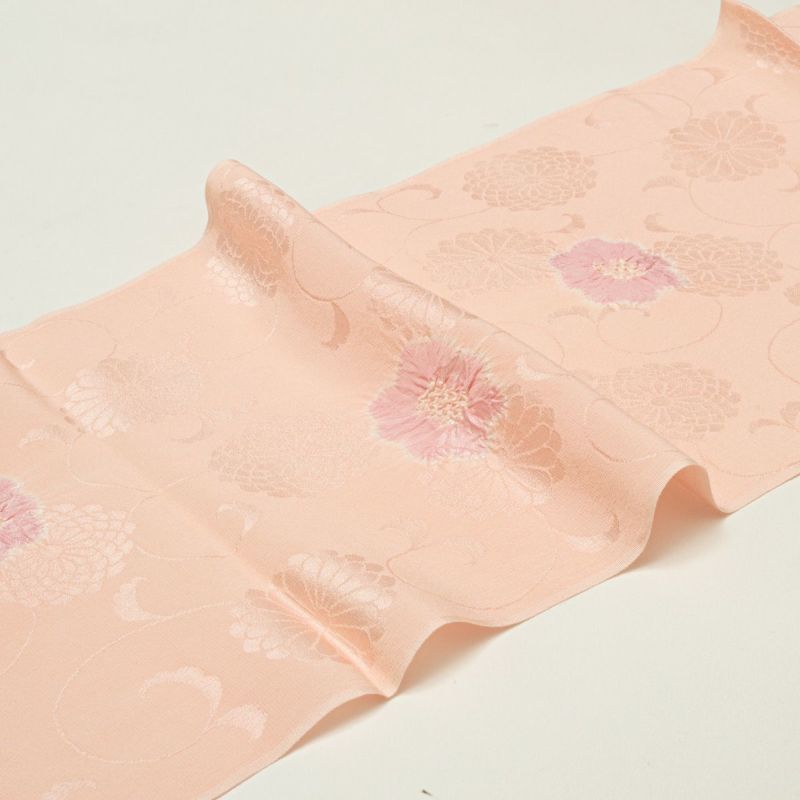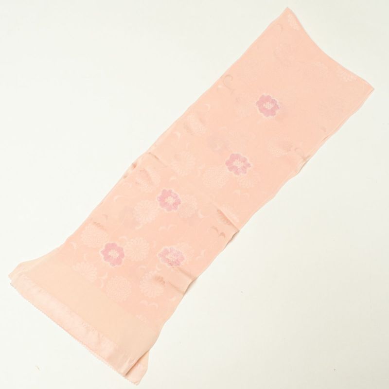 「 帯揚げ 紋綸子 絞り 輪出し 花文 水柿 紅梅色 正絹」です。