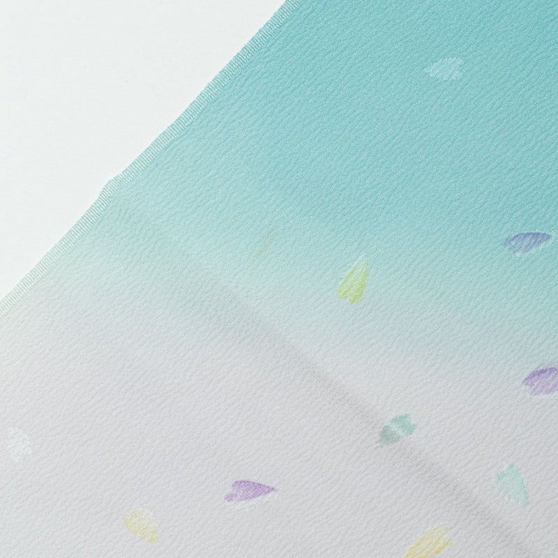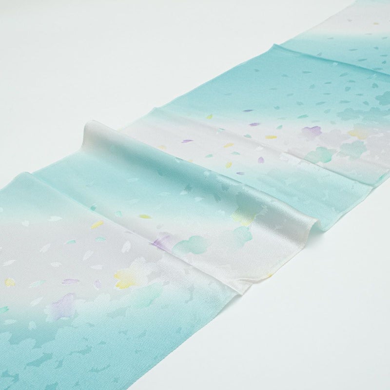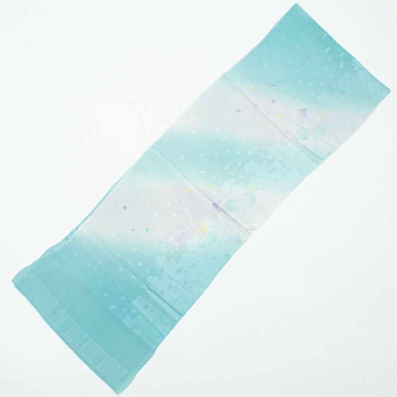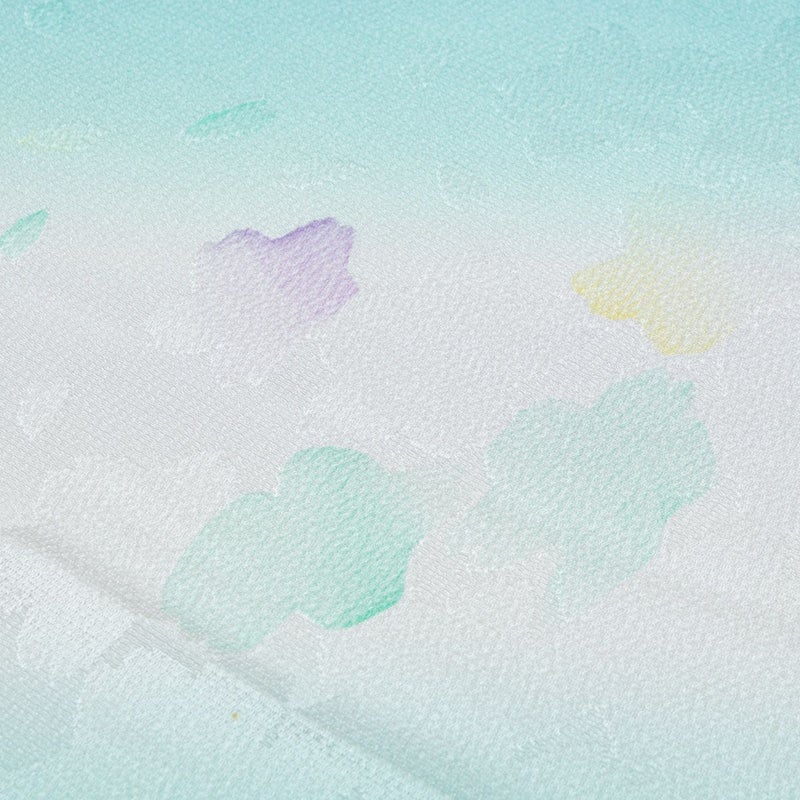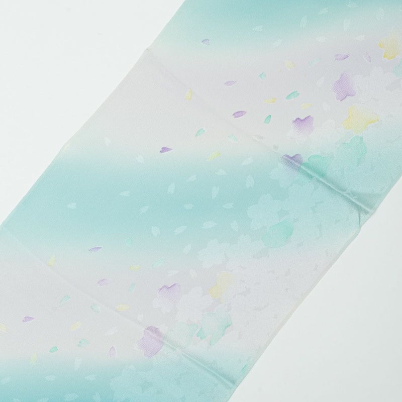 「 帯揚げ 桜の花と花びらの図 暈し 地紋起こし 薄浅葱色 白菫色 マルチカラー 正絹」です。