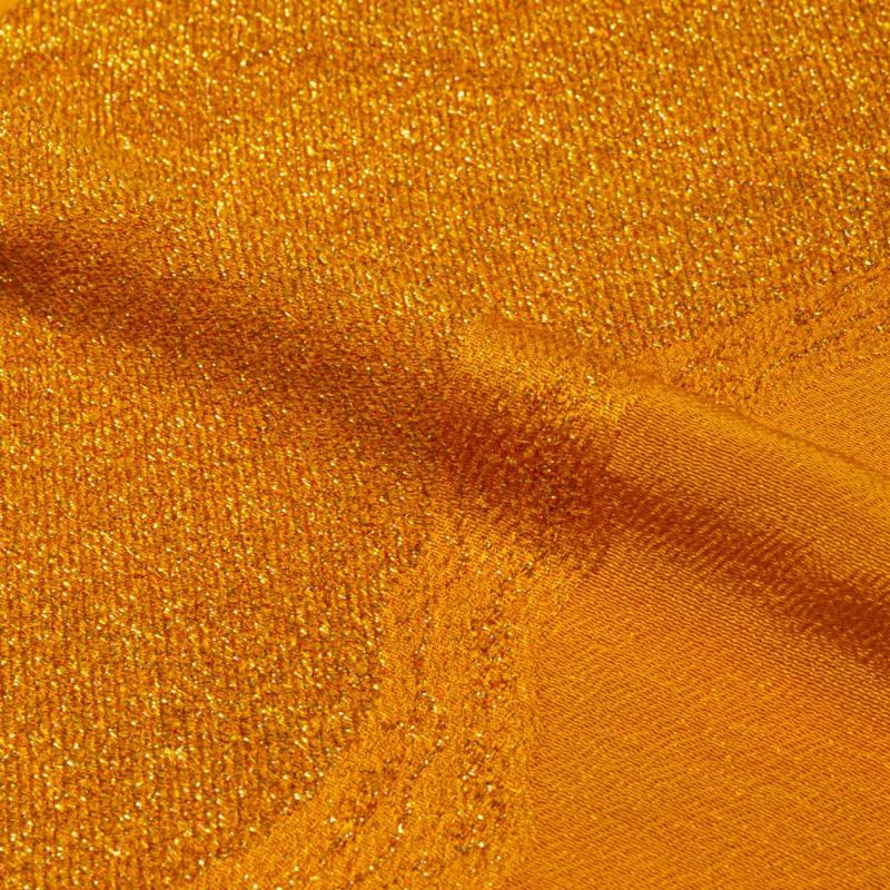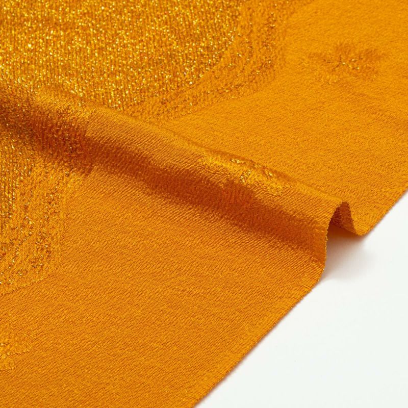 桜の花とよろけ縞を組み合わせたラメ入りの縮緬紋意匠に、金茶(きんちゃ)の無地染めを施した上品な一品です。