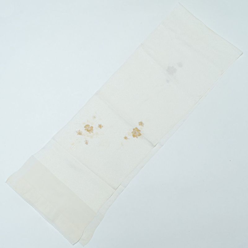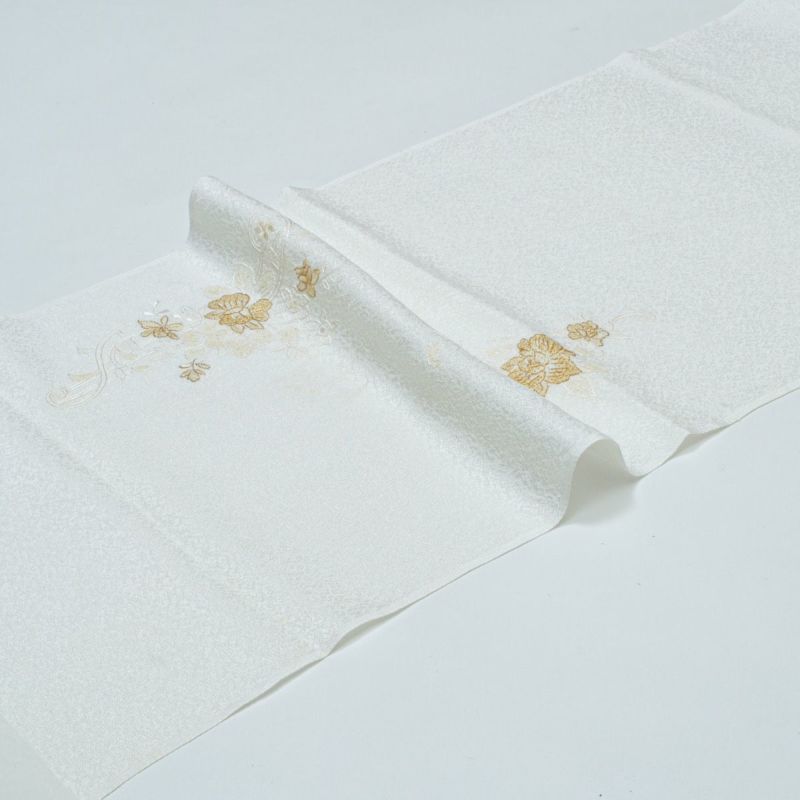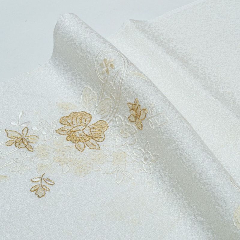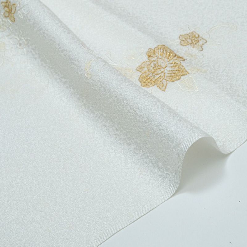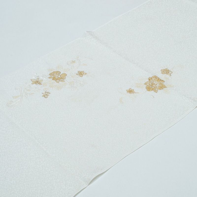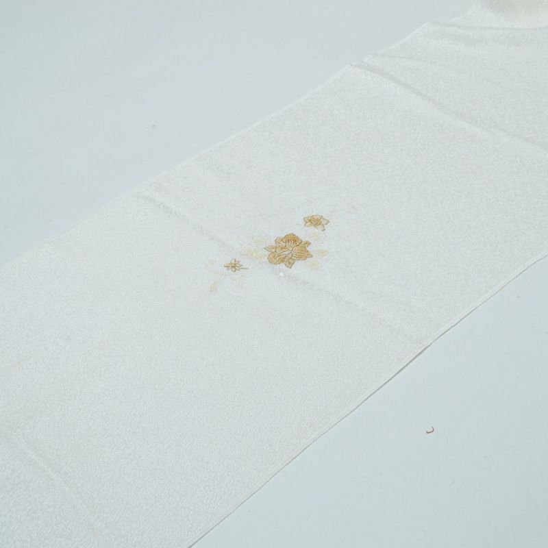 「帯揚げ 梨地 刺繍 植物文 金糸入り オフホワイト 正絹」です。