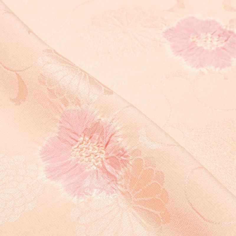 「 帯揚げ 紋綸子 絞り 輪出し 花文 水柿 紅梅色 正絹」です。
