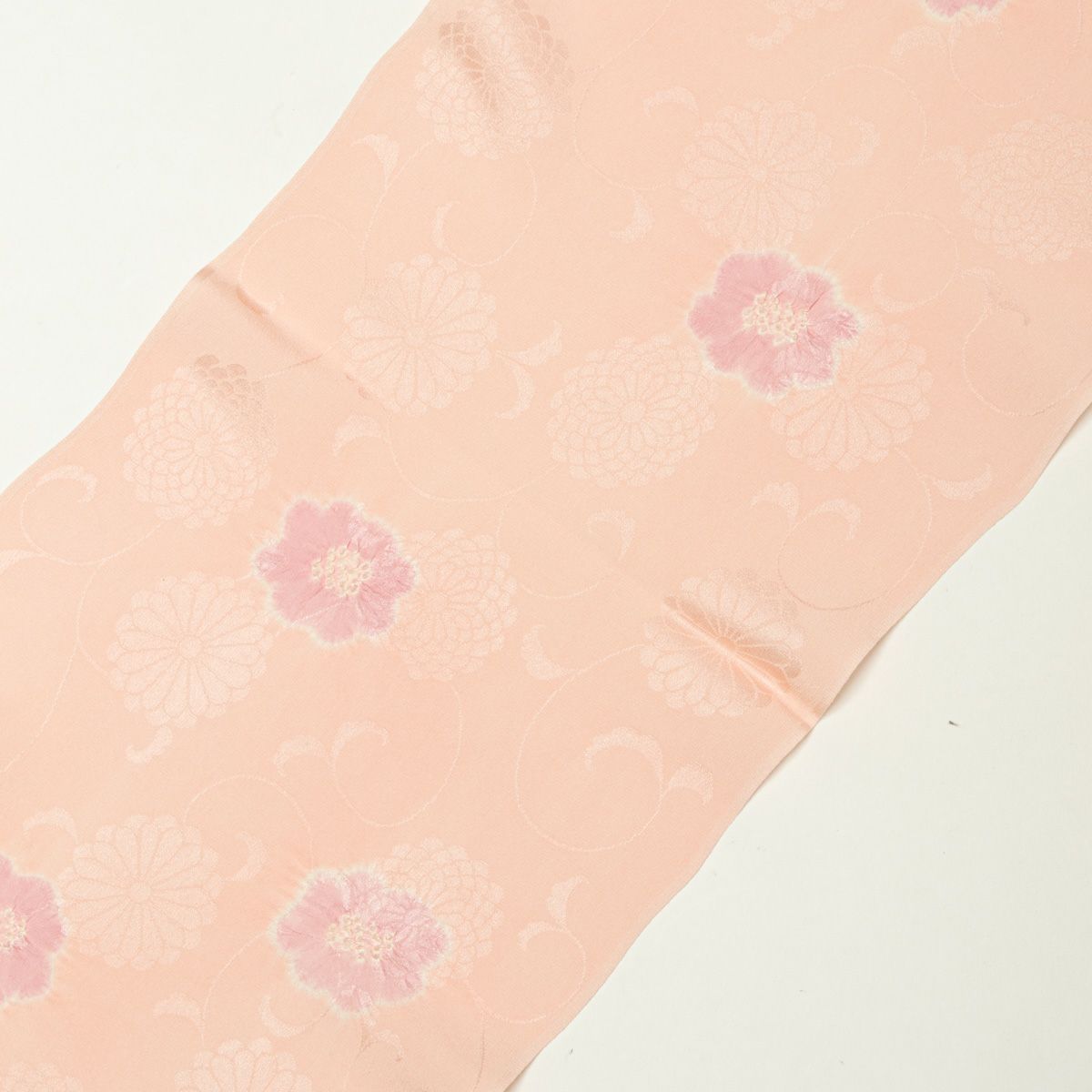 帯揚げ 紋綸子 絞り 輪出し 花文 水柿 紅梅色 正絹